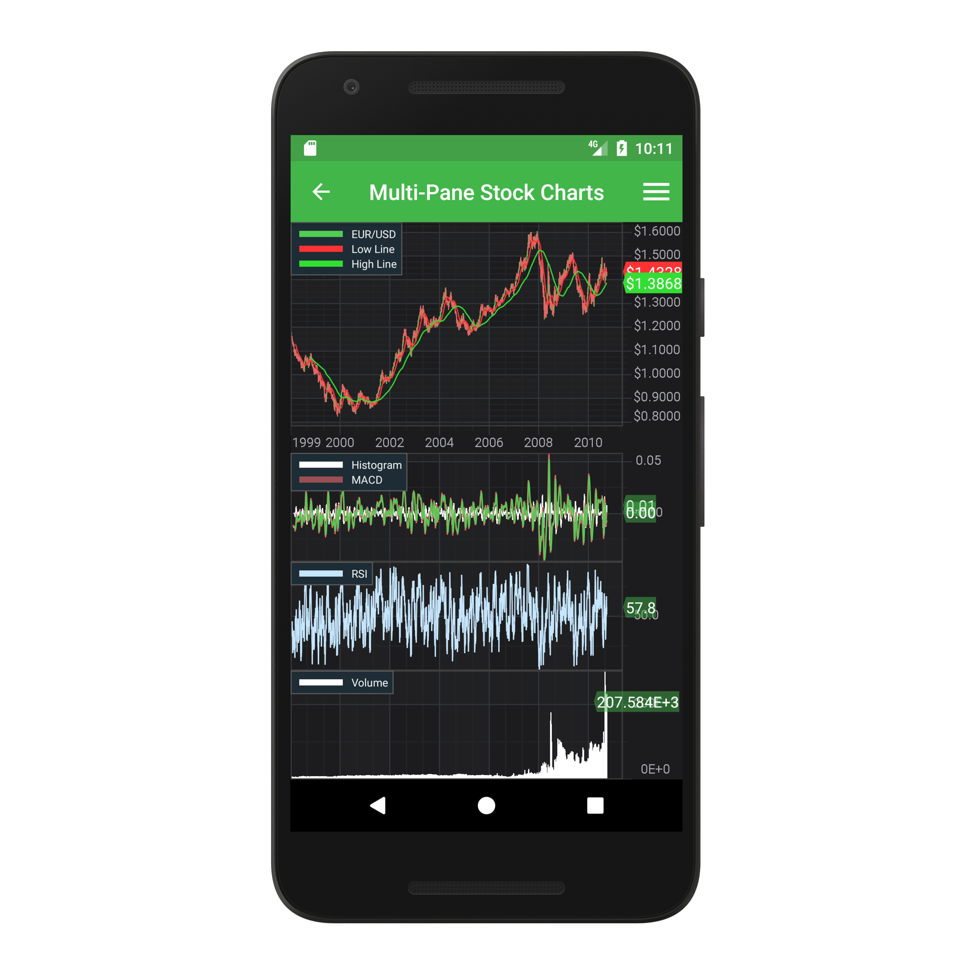 Our Android and Xamarin Android Stock Charts enable you to create true Realtime, Multi-pane Stock Chart applications. With SciChart you can add or remove panes, with different chart types. indicator & volume panes, all of which update and synchronize as you change your data. SciChart supports annotations which may be overlaid on the chart, including Text, Line, Box, HorizontalLine, VerticalLine out of the box, as well as our CustomAnnotation type which allows you to draw any UIView over the chart at a predefined location. Charts are enriched with intuitive pan, zoom and tapping functionality for working with the data in efficient way.