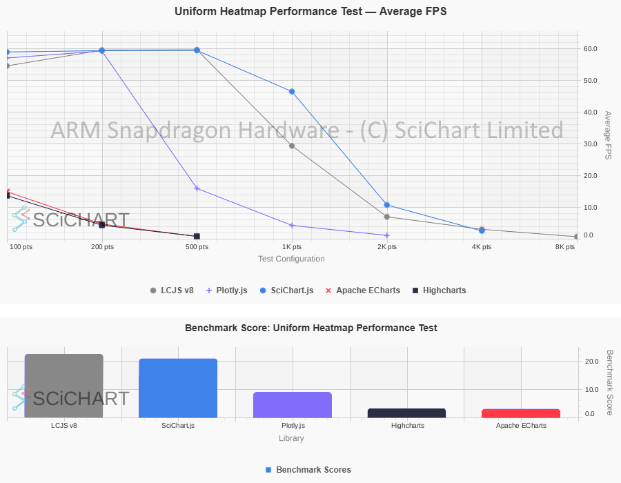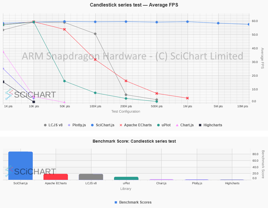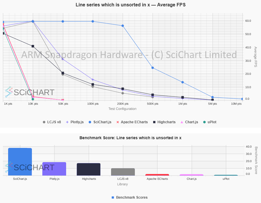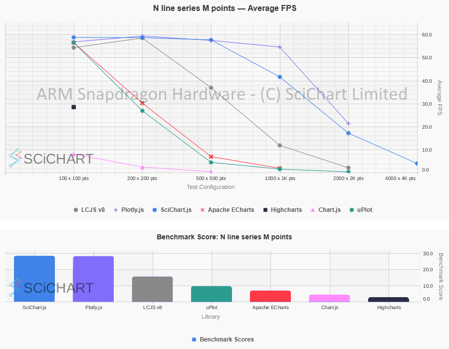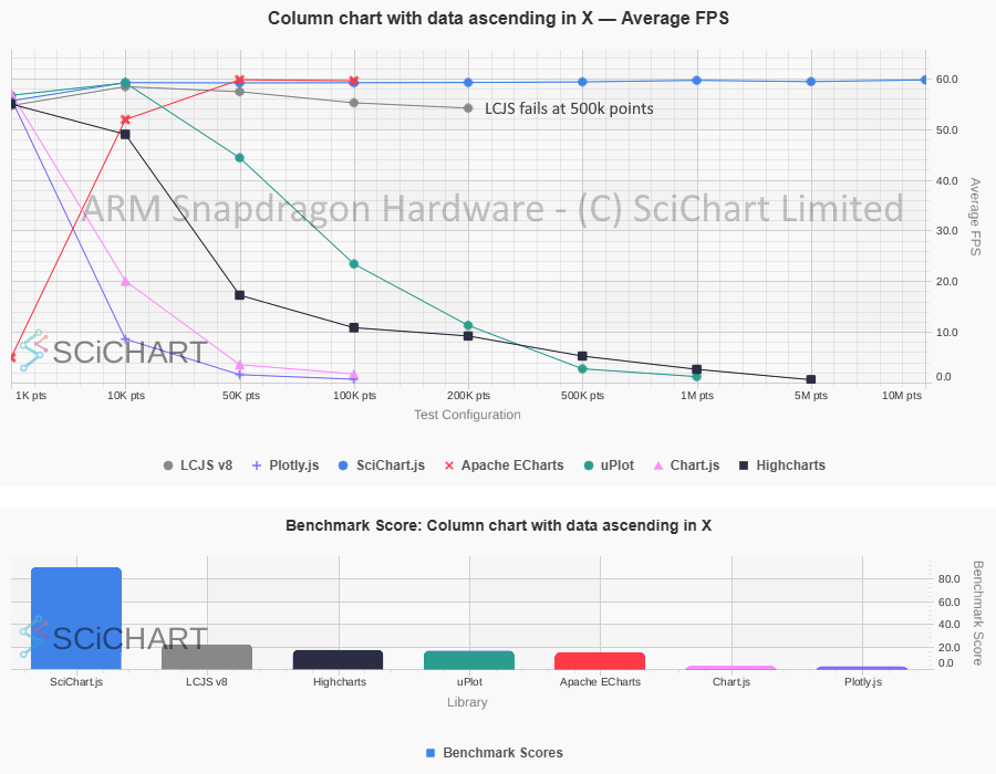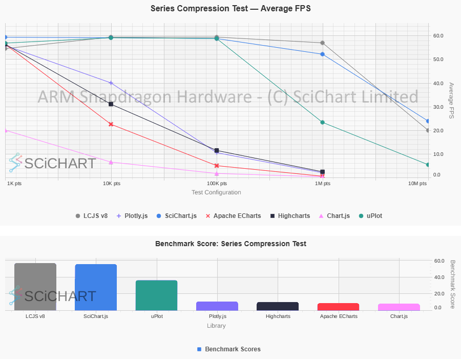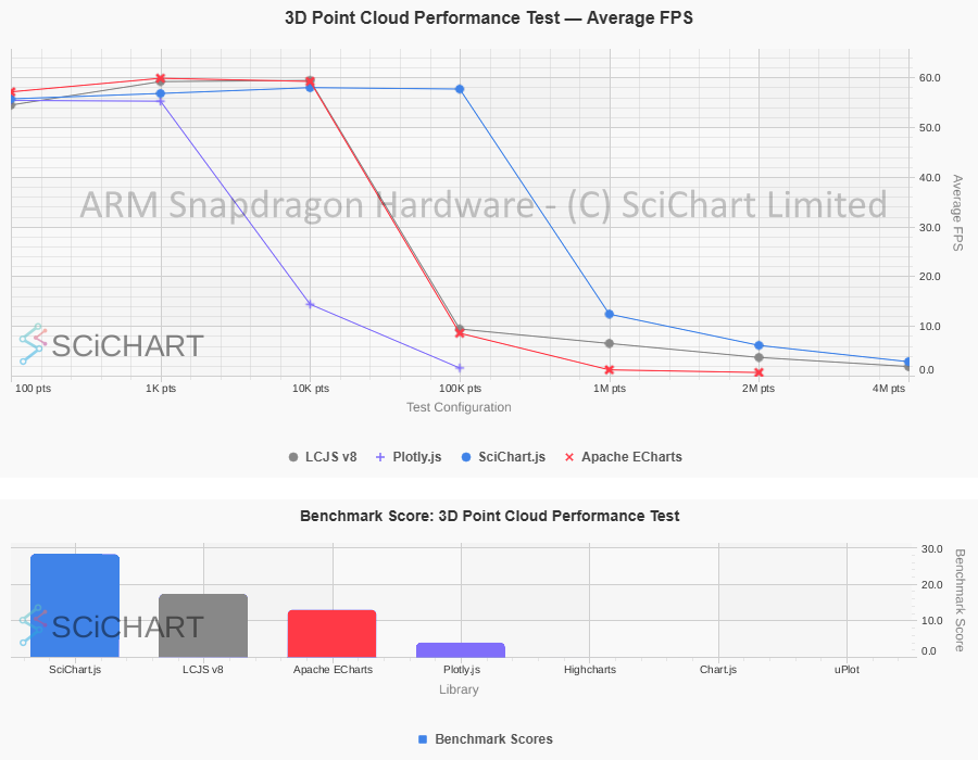 These table test results were outputted by Chart Bench and recorded on an ARM Snapdragon / Qualcomm Mini-PC with 32GB RAM, measuring FPS stats, as well as Data Ingestion Rate (points per second), Memory usage & Initialisation time under specific workloads and test conditions as published in our test suite. In this test-setup and on this specific hardware, the summary of the test-results are as follows: