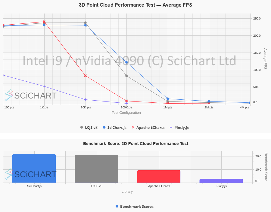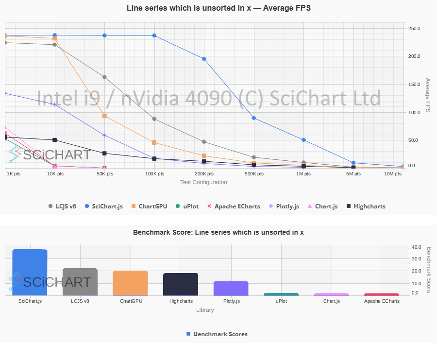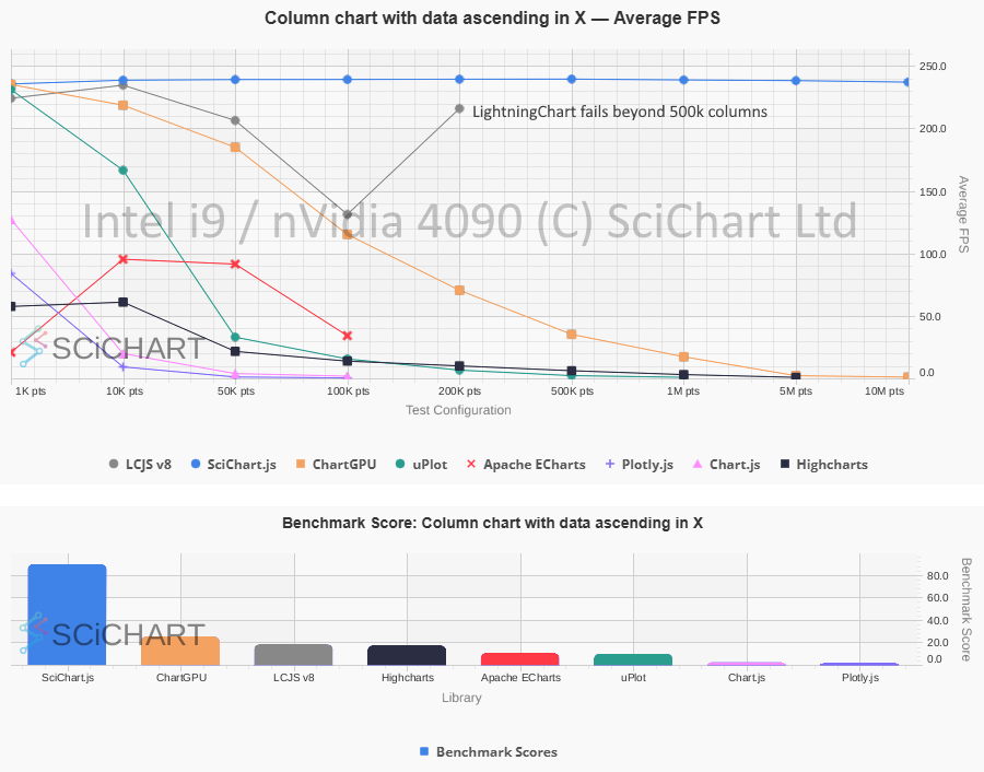 In these tests, SciChart.js v5 performs as follows vs. LightningChart v8 on an Intel i9 / nVidia 4090 workstation: