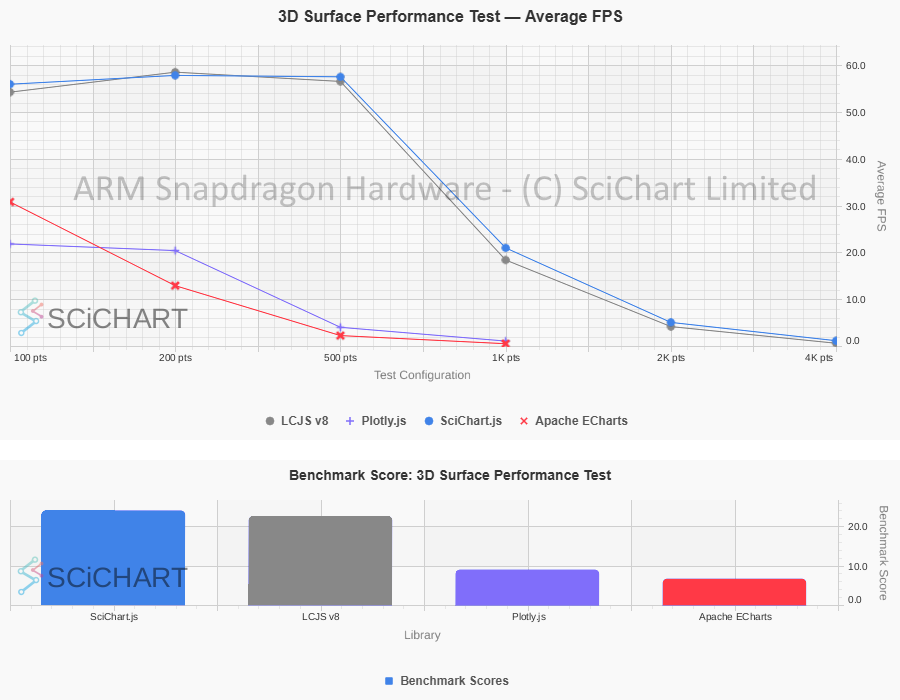 Summary: The performance gap was even wider for SciChart.js vs. LightningChart on low/mid-level hardware (ARM Snapdragon) vs high-end hardware (Intel i9 / nVidia 4090), with considerably better relative FPS scores for SciChart on the integrated Qualcomm Graphics chip. Further summary of results can be found below: