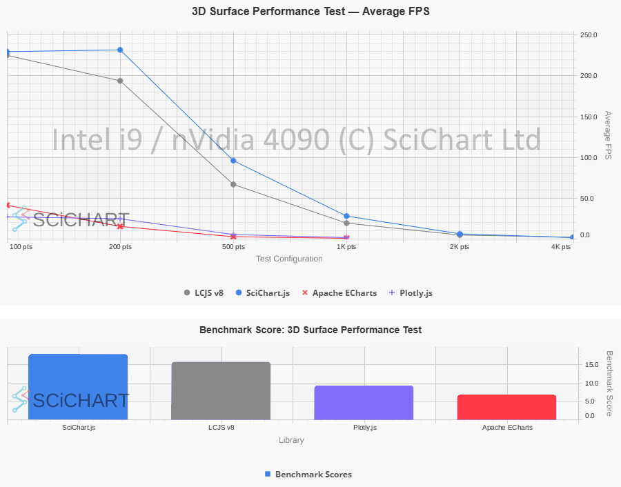 In order to evaluate performance broadly, we’ve created a JavaScript Chart Performance Test app: “Chart Bench”, which examines the performance of a number of libraries in a series of demanding tests. This application benches JavaScript Charts (including SciChart, LightningChart, Plotly.js, eCharts, Chart.js and more) in a variety of use-cases including 2D line series, real-time charts, scatter charts, candlestick and column charts, heatmaps, 3d point-clouds, 3D surface plots, and covers multi chart scenarios. We measured FPS, initialization time, memory and data ingestion rate (points-second).
