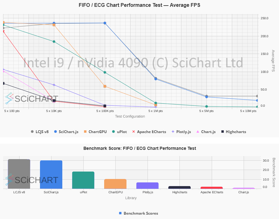 | Realtime FIFO / ECG Chart Test | SciChart.js v5 FPS | LightningChart v8.2 FPS | Fastest | % Change |