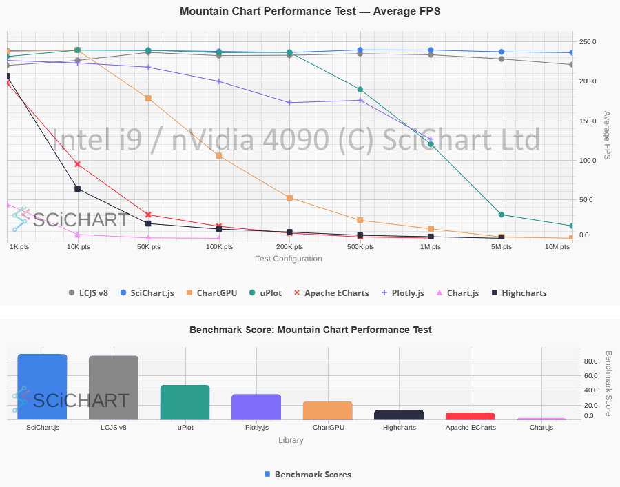 | 1000 points, 1000 series | 41.57 | 11.8 | SciChart.js | 252.29% |