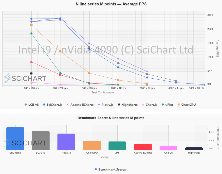 Below are a selection of graphs outputted by Chart Bench which can be viewed at the end of a test run. These graphs include all the chart libraries tested: SciChart.js, HighCharts, Chart.js, Plotly.js, Apache eCharts, uPlot, ChartGPU, LightningChart.js (LCJS) versions 4.2.2 and 8.2.0. FPS results means “frames per second” (higher is better). An aggregated “Chart Bench score” is also computed (explained in this blog) which takes into account FPS, Memory usage, Init time and total number of frames rendered.
