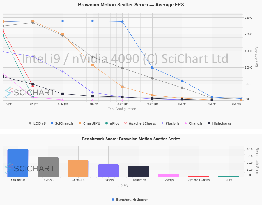 For applications with demanding big-data or performance requirements, SciChart with its GPU-accelerated charts is one of the few libraries in our public Chart Bench benchmark suite that performs competitively with LightningChart in these scenarios. We’ll share some performance test results below and compare the two libraries from a developer perspective.