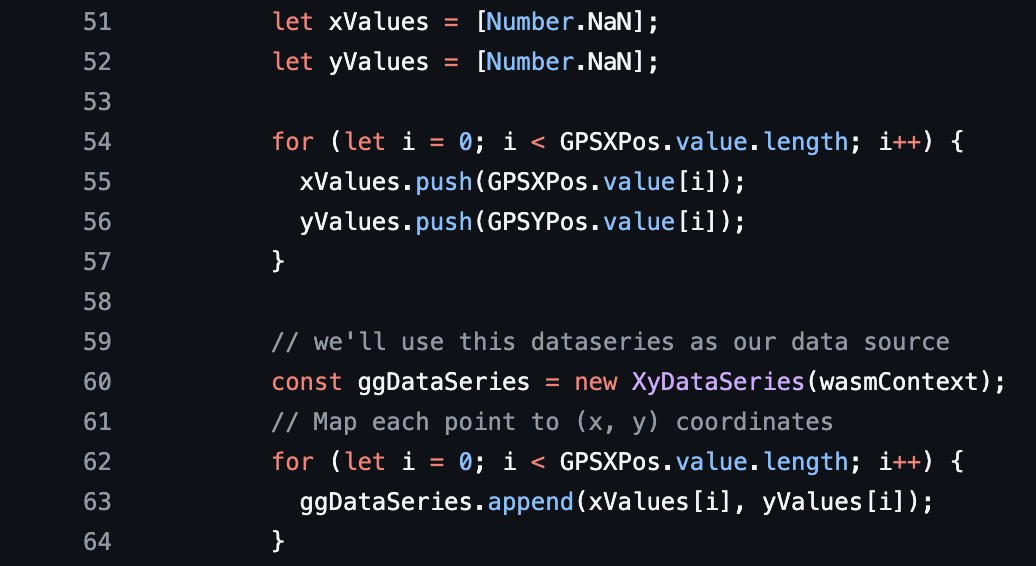 - Creating a Track Map with Scichart Scatter Plots: This element allows WashU Racing to use their latitude and longitude data to create a live map of the race course. It’s important to keep track of their map, as the team is constantly changing the track when testing in order to test different aspects of the car.