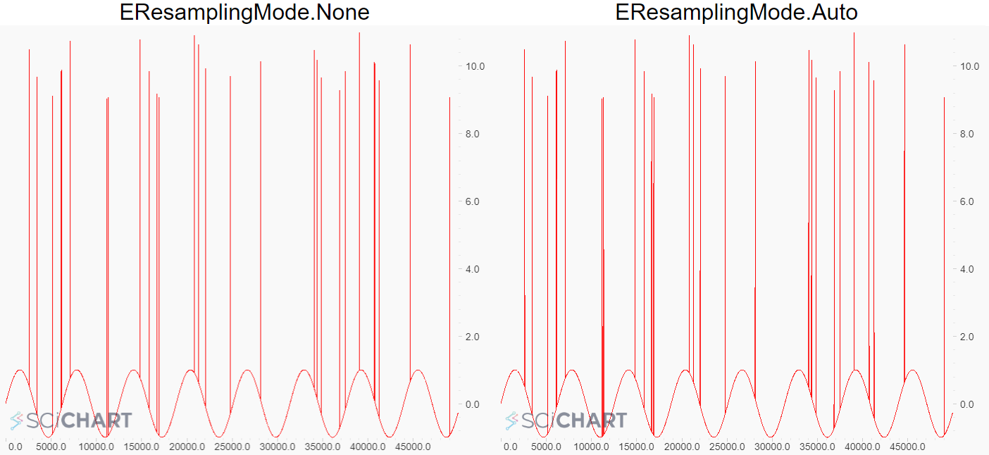 We recommend leaving resamplingMode as Auto unless debugging the visual output of the chart. This will massively impact performance and is not necessary, as SciChart automatically chooses the correct algorithm and strategy to maintain visual output while hugely improving performance.