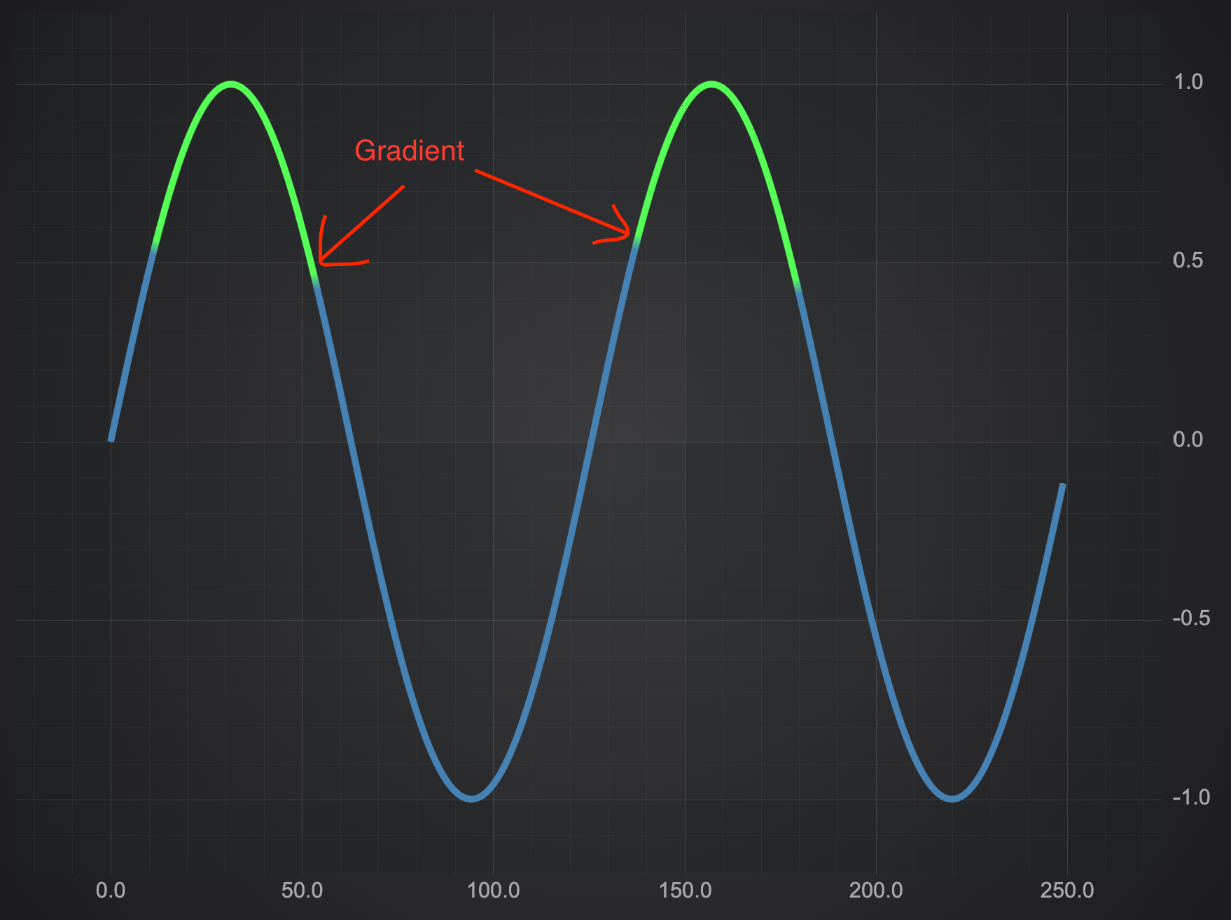 Line series can be colored per-point or per line-segment using the PaletteProvider API. To use this, we must create a class (typescript) or object (javascript) which implements or confirms to the IStrokePaletteProvider📘 interface. Then, apply this to the FastLineRenderableSeries.paletteProvider📘 property.