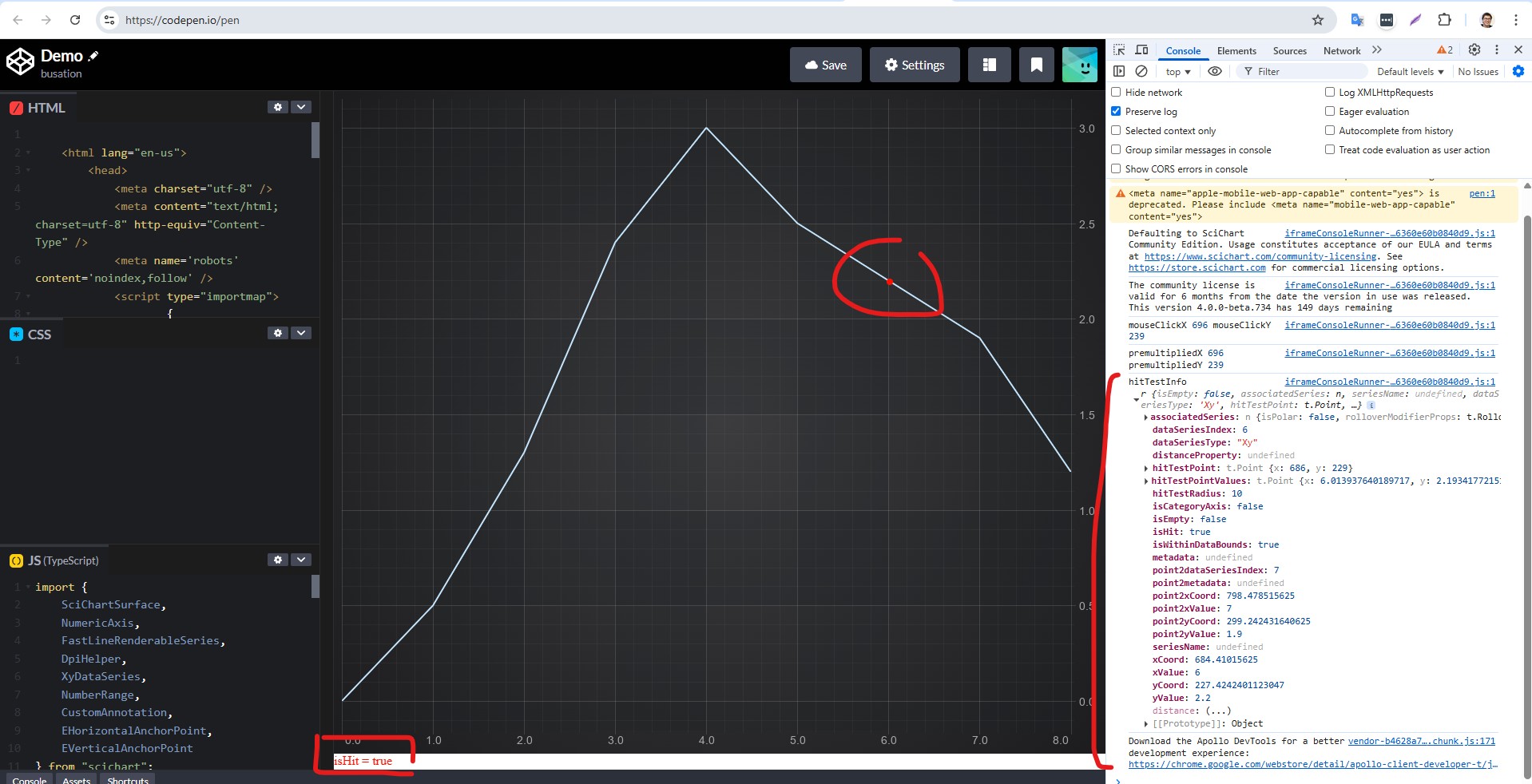 On the canvas we will see the red dot where the click was performed. If the click was within 10 pixels from the line, under the chart we will see isHit = true. In the browser console the HitTestInfo object itself will be output.