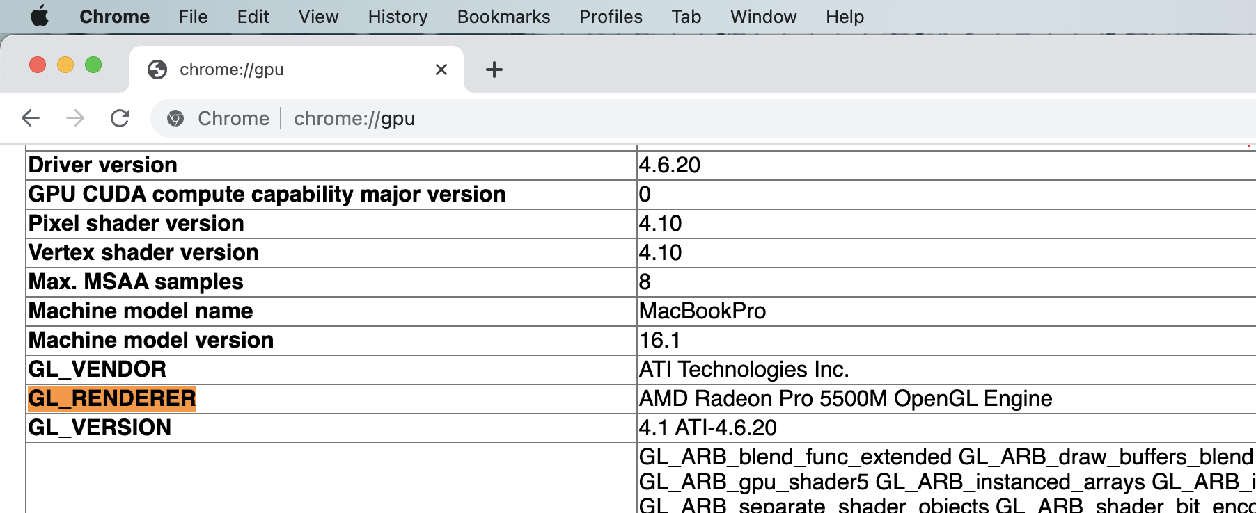 Scroll down to GL_RENDERER. On the right you can see the current GPU e.g. 'AMD Radeon Pro 5500M' or 'Intel UHD 630'