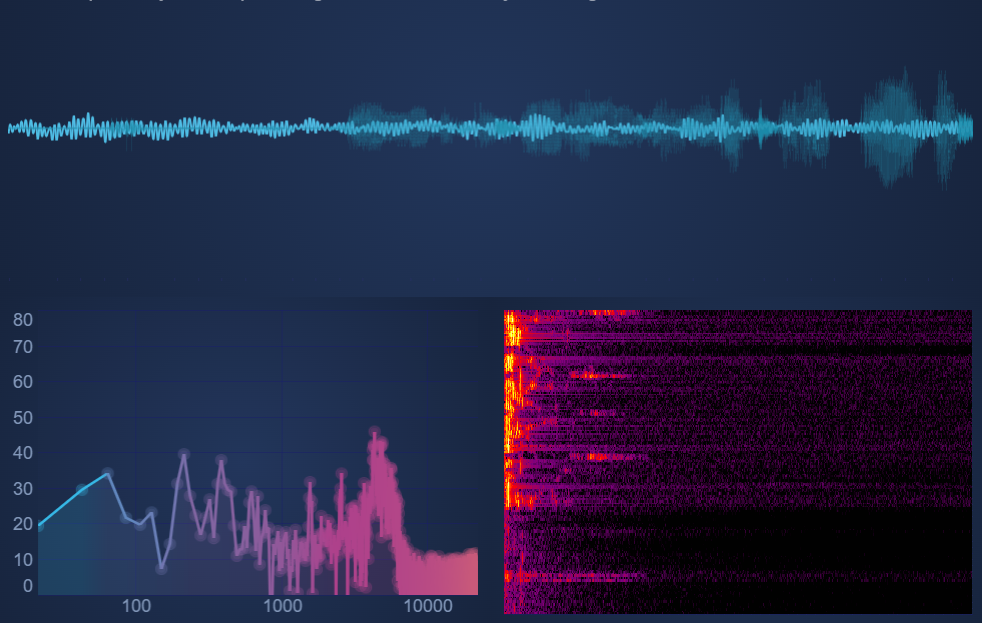Take the example from the SciChart Demo - Realtime Audio Analyzer. This has three charts arranged in two rows, where the bottom row has two columns. The chart types are Line, Mountain and Heatmap.