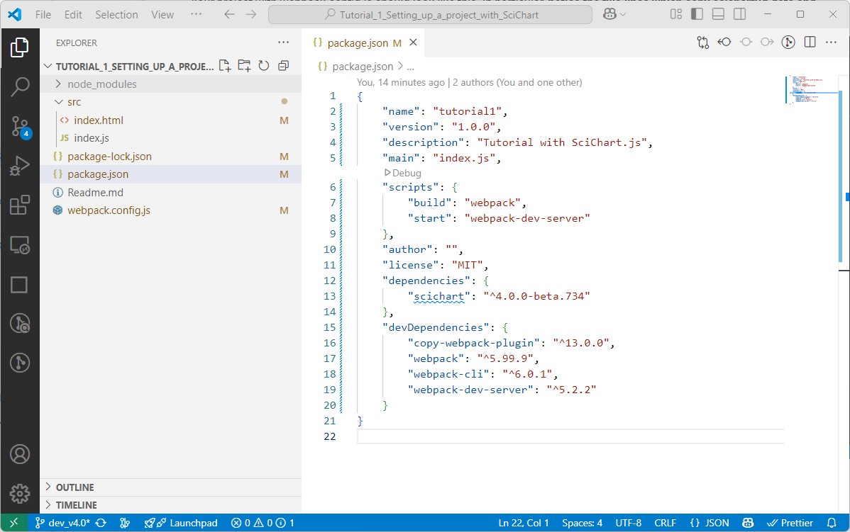In this tutorial we will create a simple line chart with SciChart.js. We'll show you how to create a new JavaScript project in VSCode and adding SciChart libraries as dependencies to it.