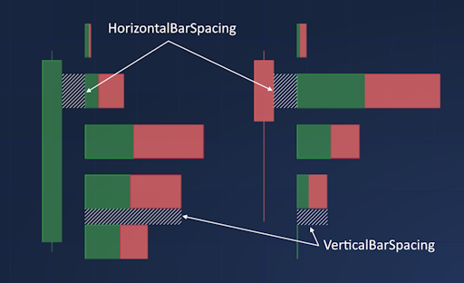 The histogram spacing can be adjusted by using the HorizontalBarSpacing and VerticalBarSpacing properties. The horizontal bar spacing specifies the distance between the candlestick and its corresponding histogram, whereas the vertical bar spacing defines the separation between individual histogram bars.