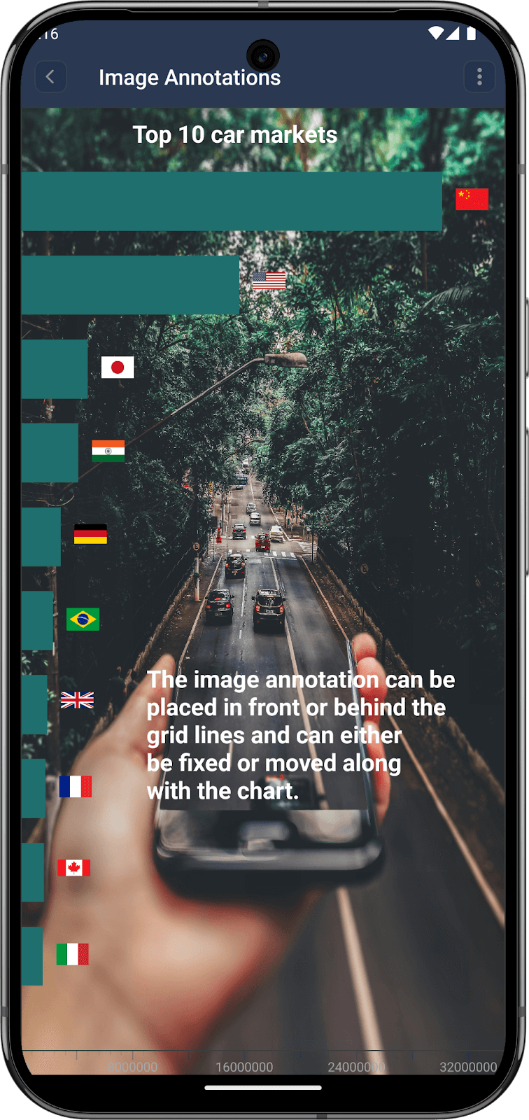 Add images to your chart dynamically using ImageAnnotation. These are drawn using native rendering, so they can be drawn at different layers, including between the gridlines and the series. Normal CustomAnnotations use a separate view and so can only go in front of everything or behind everything. Example code:
