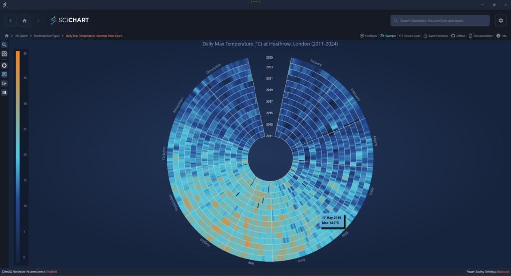 This example demonstrates how to create a Polar Uniform Heatmap using SciChart to visualize real-world maximum daily temperature data spanning multiple years. The chart presents long-term seasonal patterns and temperature trends in a visually intuitive circular layout. The heatmap is built from a 2D array, where each row represents a year and each column corresponds to a day within that year.